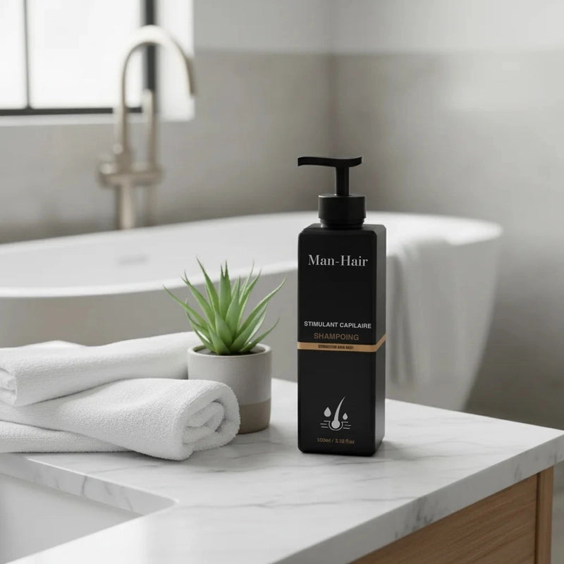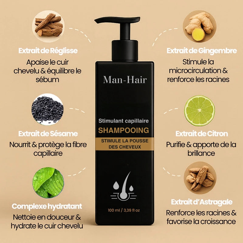 Formulé par des experts capillaires, le Shampoing Activateur de Racines Hair-Man associe une synergie d’extraits naturels – Réglisse, Gingembre, Sésame, Citron et Astragale – pour nettoyer en profondeur, rééquilibrer le cuir chevelu et stimuler les follicules en sommeil.